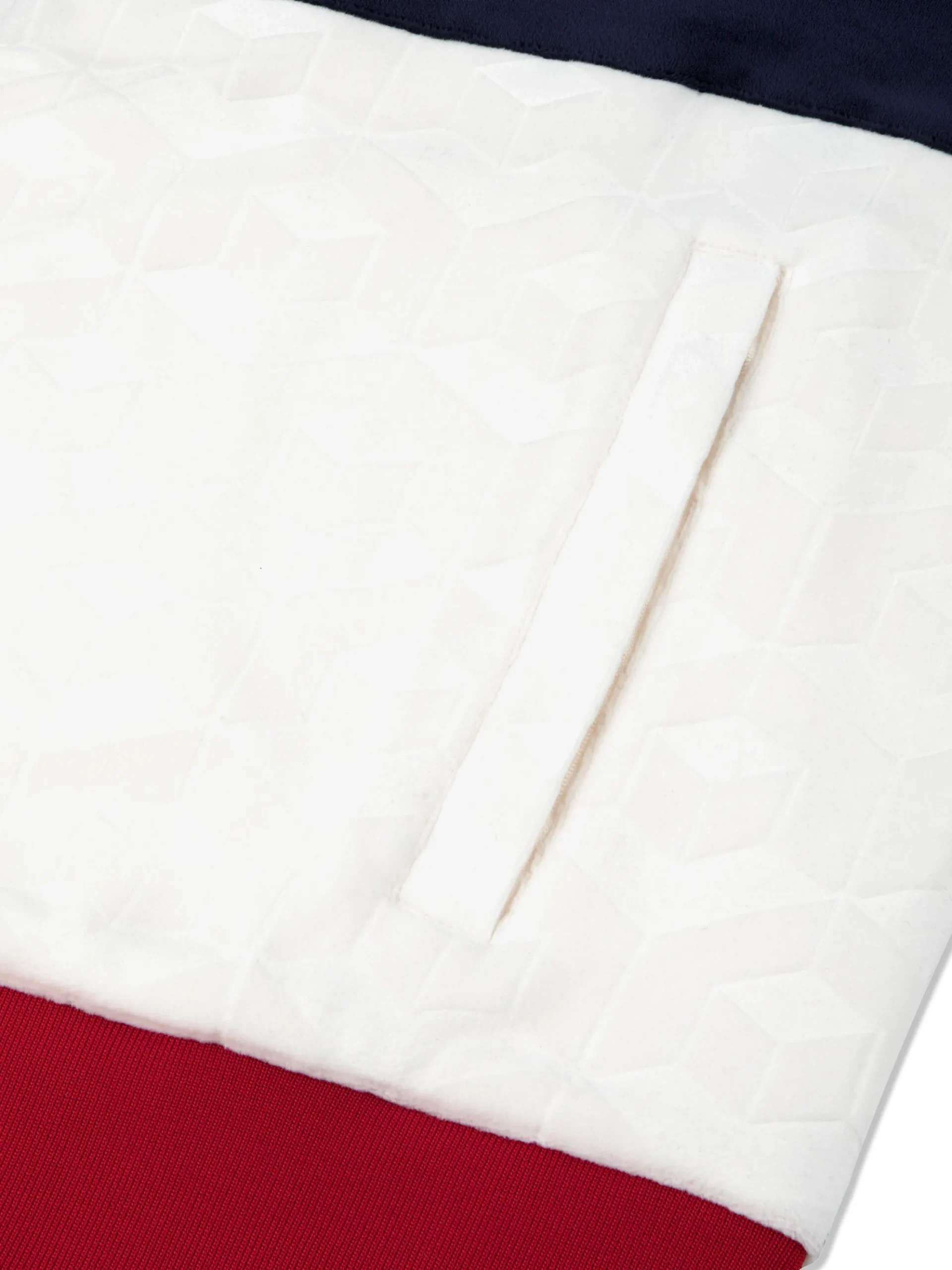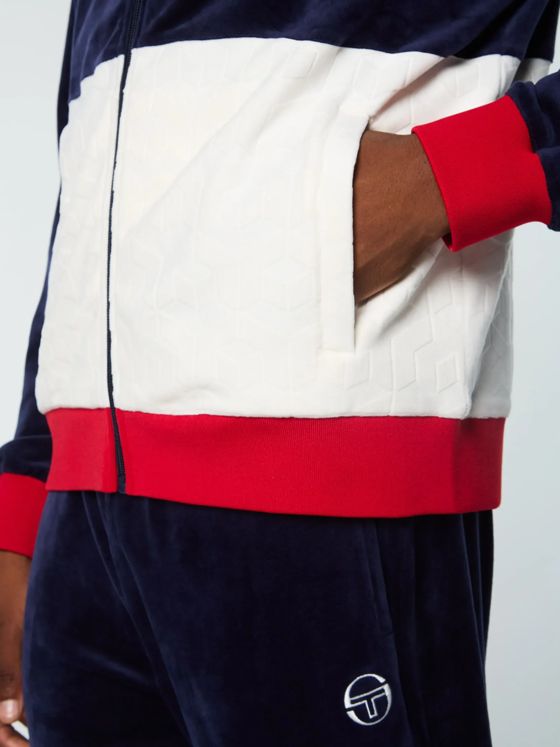 Premium debossed velour track jacket93% polyester / 7% spandex velourColor-blocked silhouetteDebossed geometric repeat m…