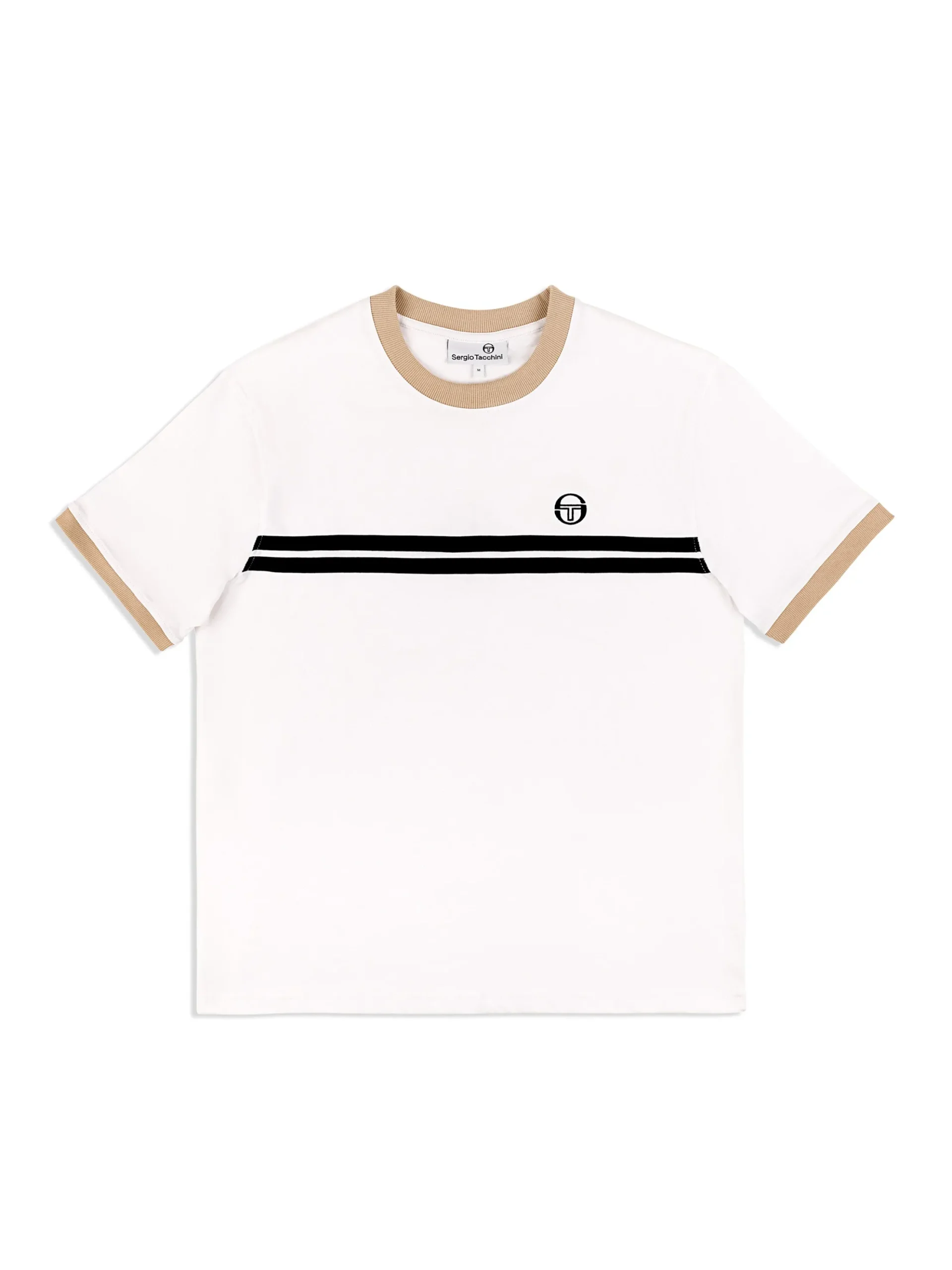The Supermac T-Shirt Archivio is inspired by our classic Supermac Polo, worn throughout the ’80s by tennis champ John McEnroe and a staple among British ‘casuals.’ Featuring contrast double stripe taping across the chest and our iconic ‘ST’ monogram logo embroidered at left front, the tee is part of our Archivio collection—celebrating classic designs from the Tacchini archive.