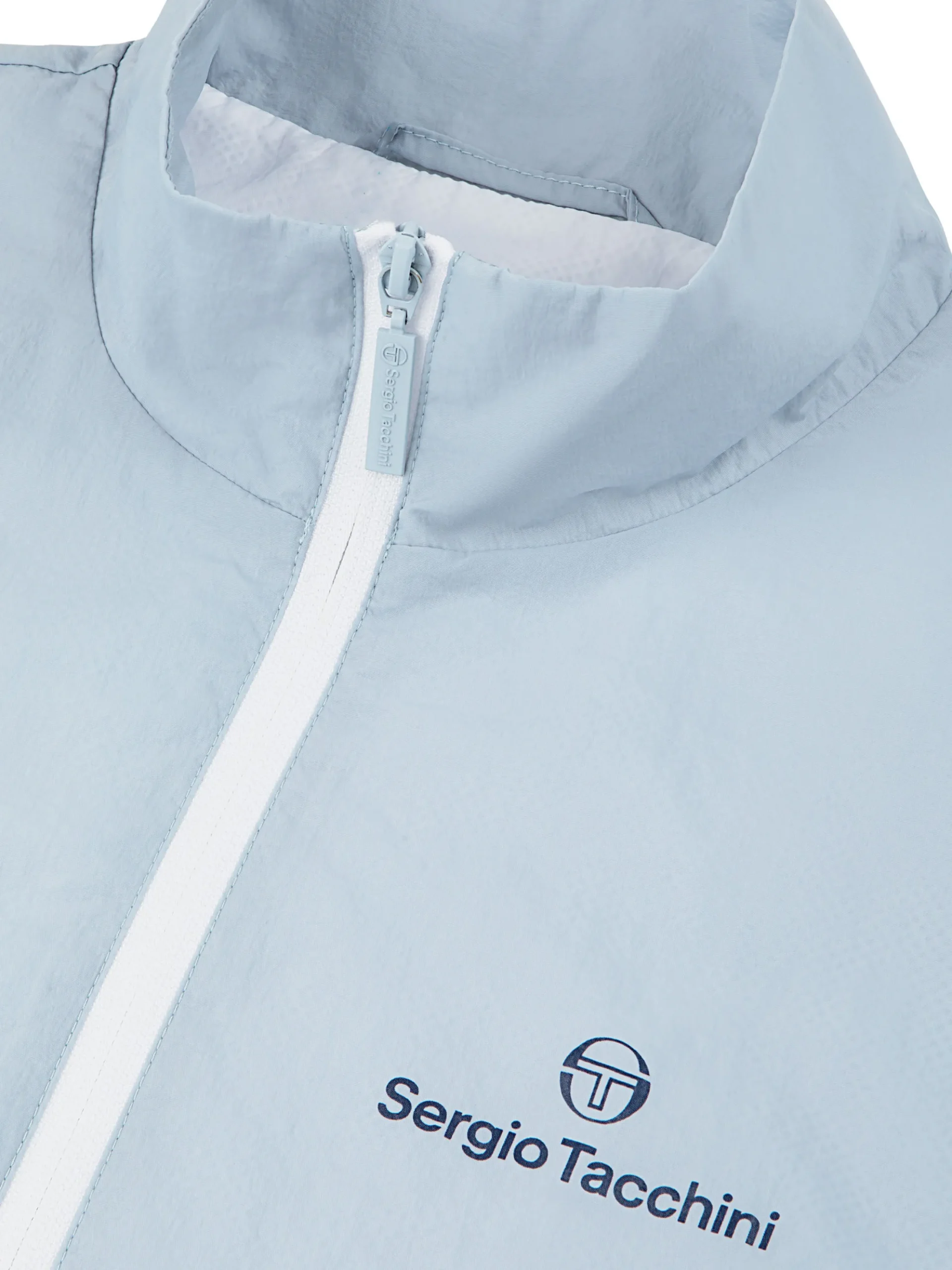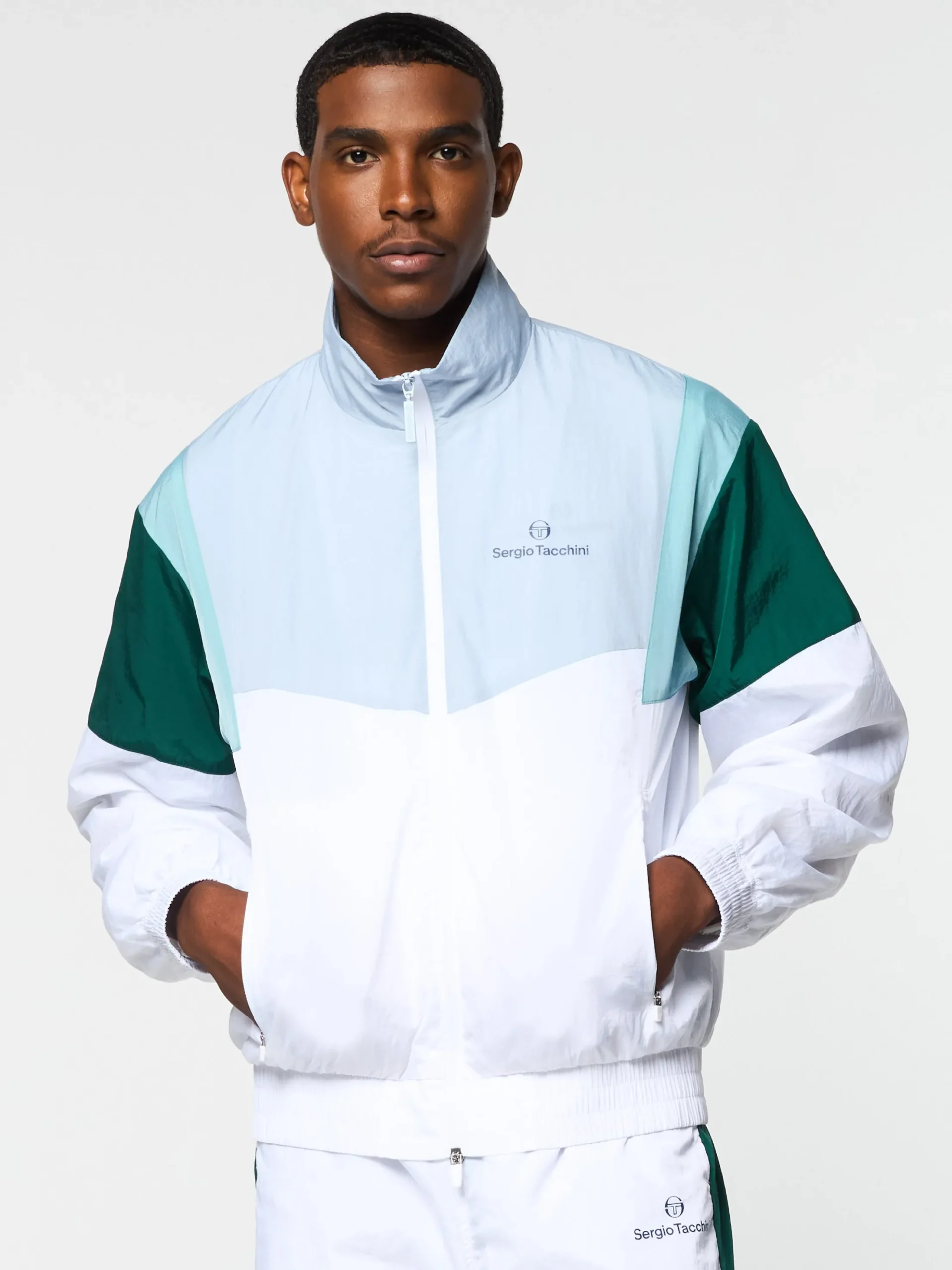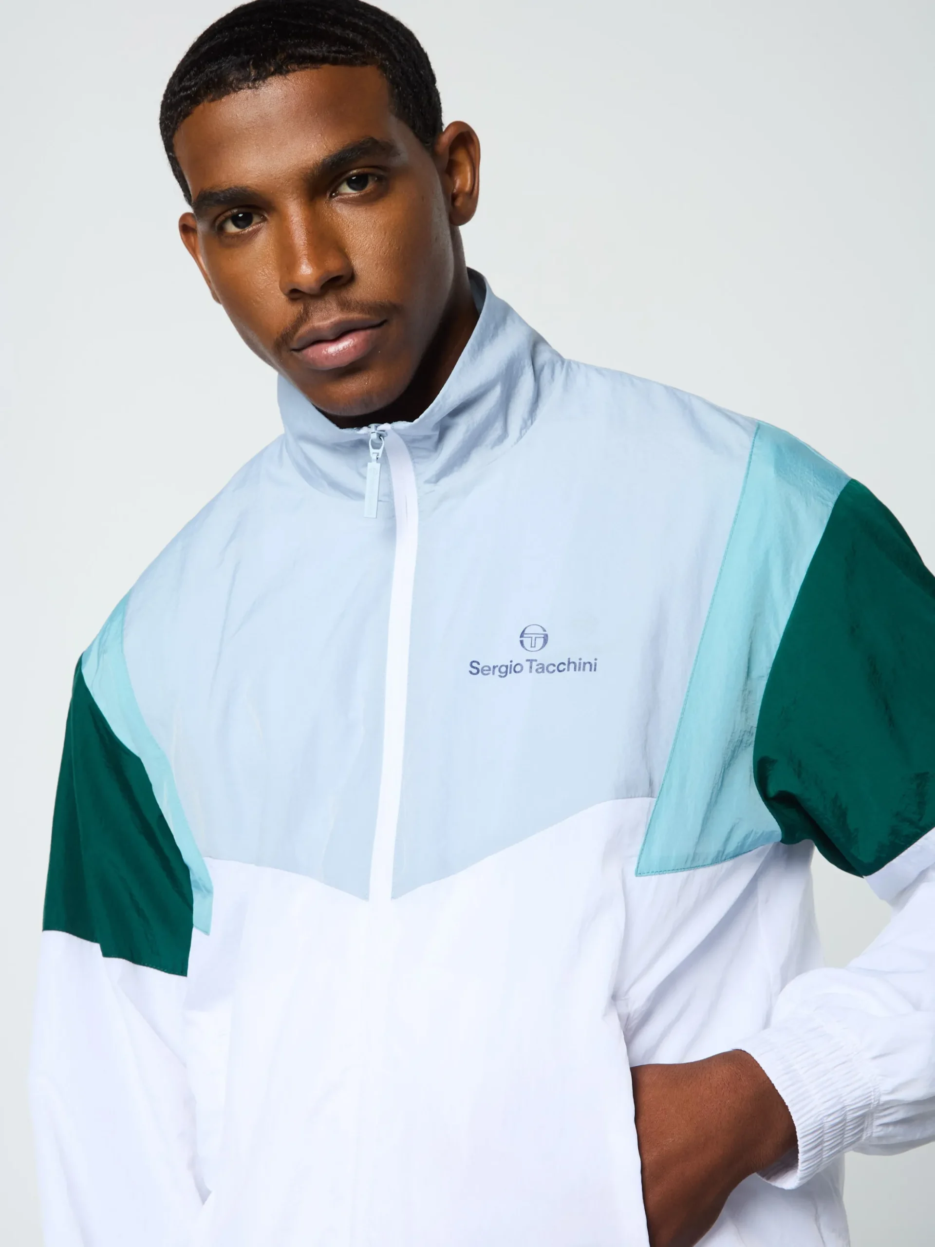 The Angolo Track Jacket is made of our signature crinkle nylon in a color-blocked silhouette with chevron seam detailing for a retro vibe. Perfect for a workout or a night out on the town, this lightweight full-zip track jacket is complete with zip-secured pockets, elastic trims, and a Sergio Tacchini logo at the left chest.