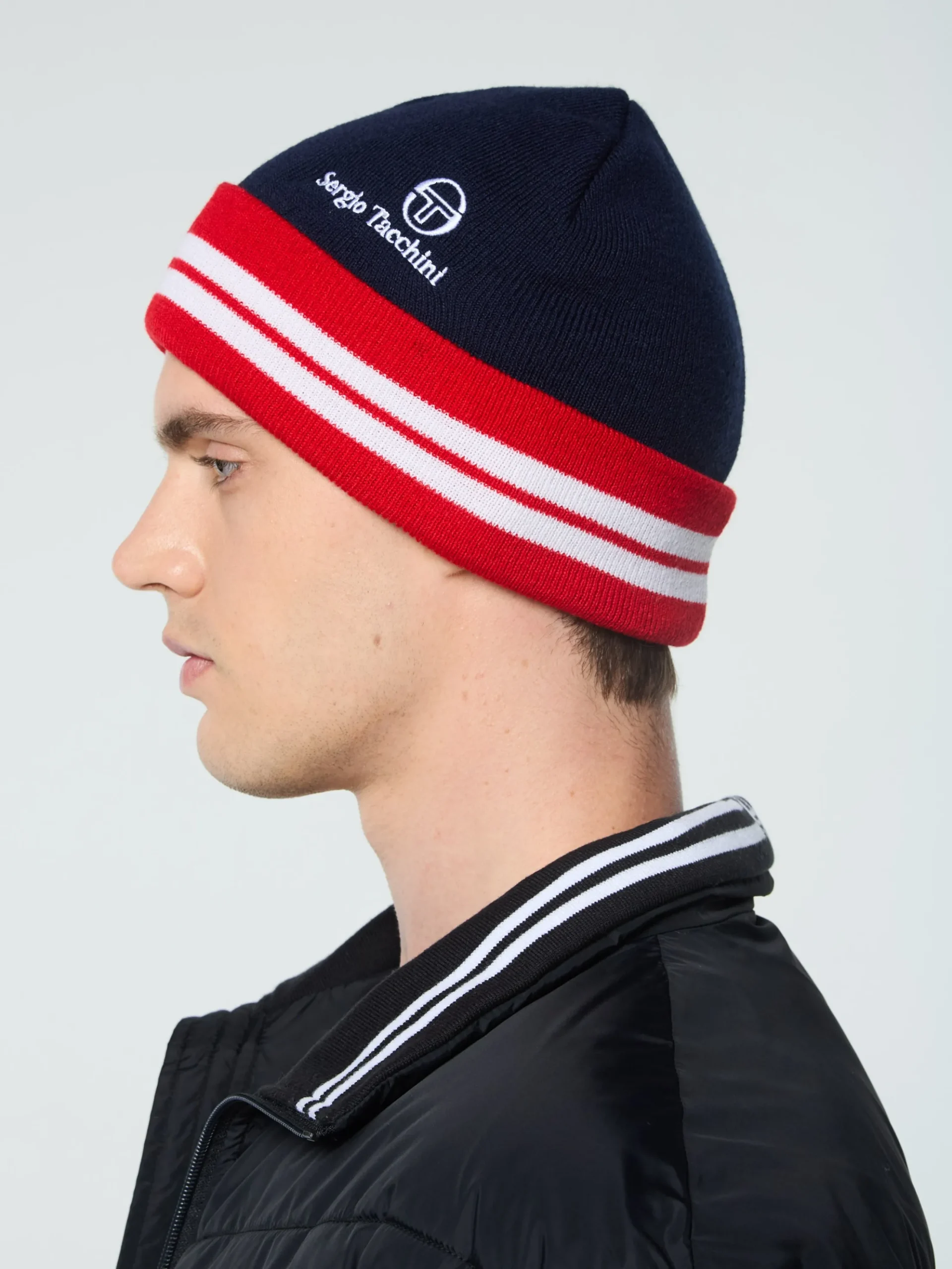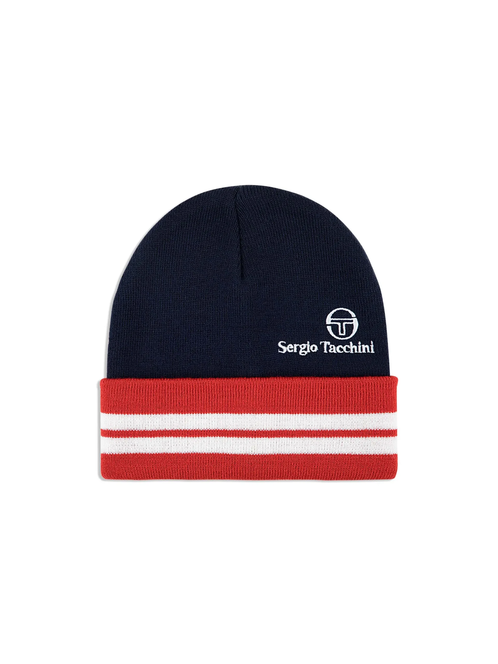 Perfect for when temps drop, the Surgis Knit Beanie is a classic fit fold-over watch cap featuring a contrast cuff with double stripe detailing. Complete with an embroidered Sergio Tacchini logo, this elevated beanie will keep you warm and stylish wherever you’re off to.