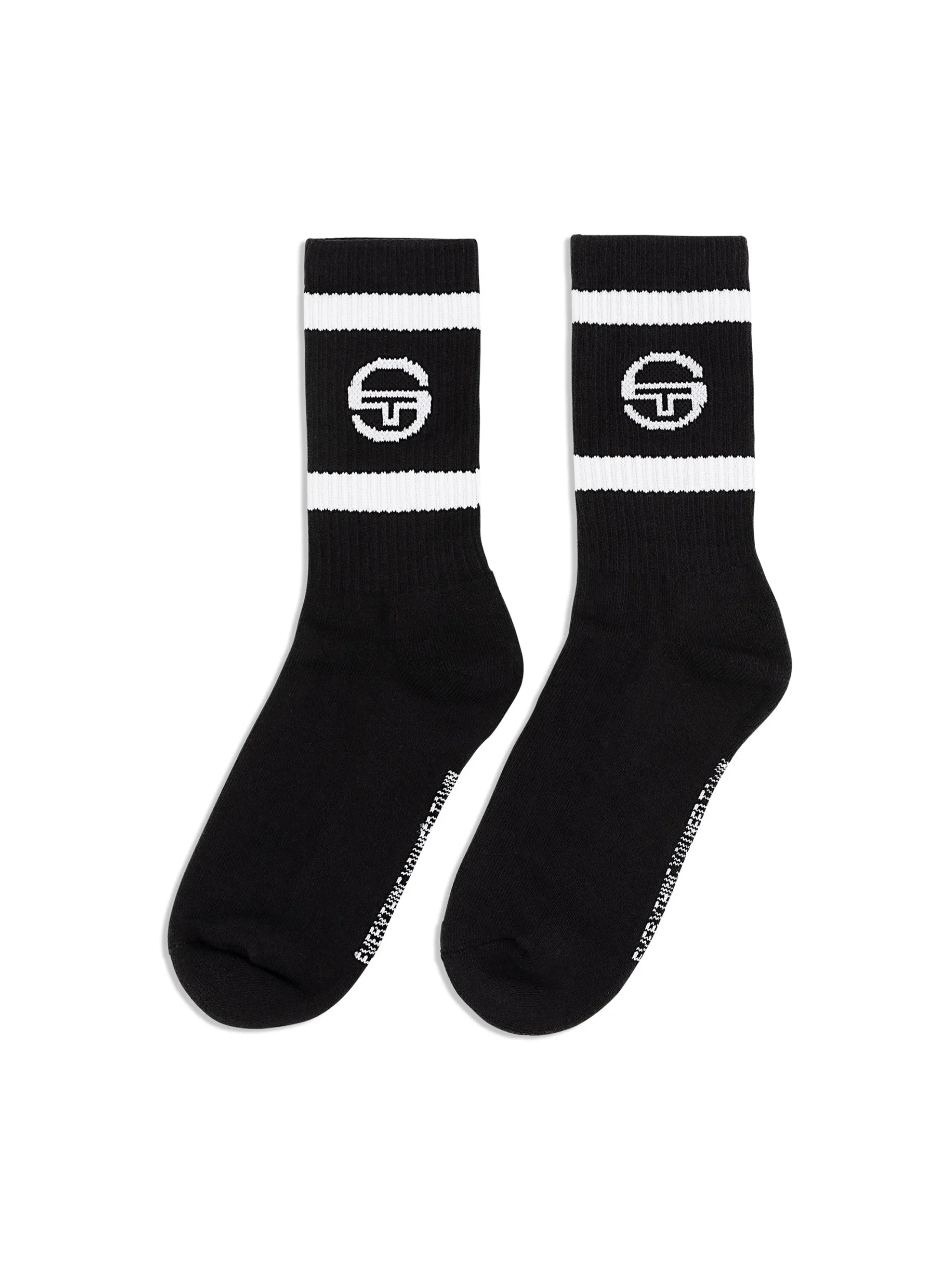 An on-and-off-court essential, the crew-length Tennis Sock features Sergio Tacchini’s iconic ‘ST’ monogram logo at the athletic-ribbed upper and the brand’s ‘Everything You Need to Win’ slogan at the cushioned footbed.