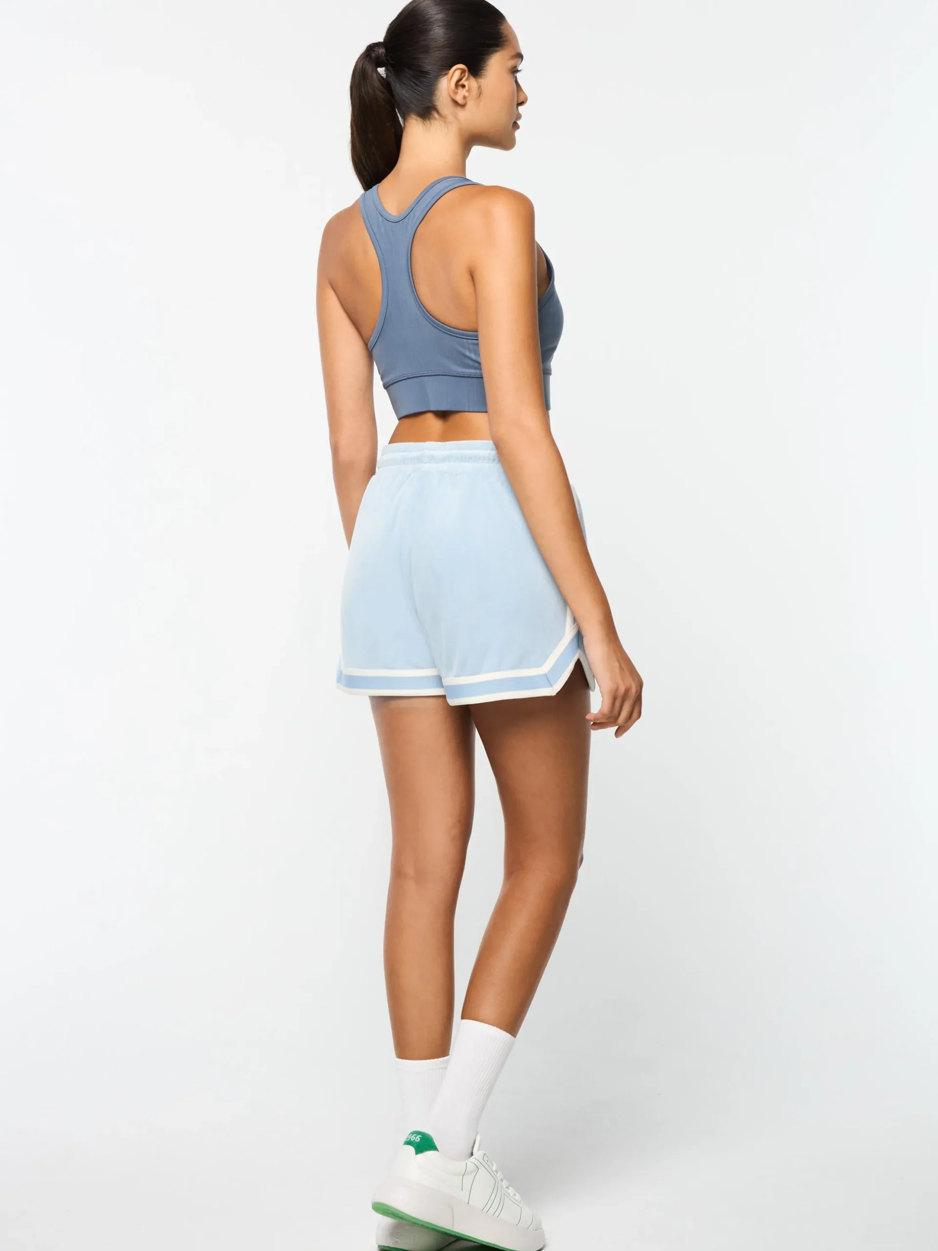 Crafted from ultra-soft velour, the Veneto Short features a plush chenille ‘ST’ monogram patch and contrast striping accents for a playful twist on varsity athletics and cheerleader fashion. Complete with a comfy drawstring waistband and a retro notched hem, these luxe shorts are part of our seasonal “New Ivy” capsule—a contemporary take on collegiate prep aesthetics.